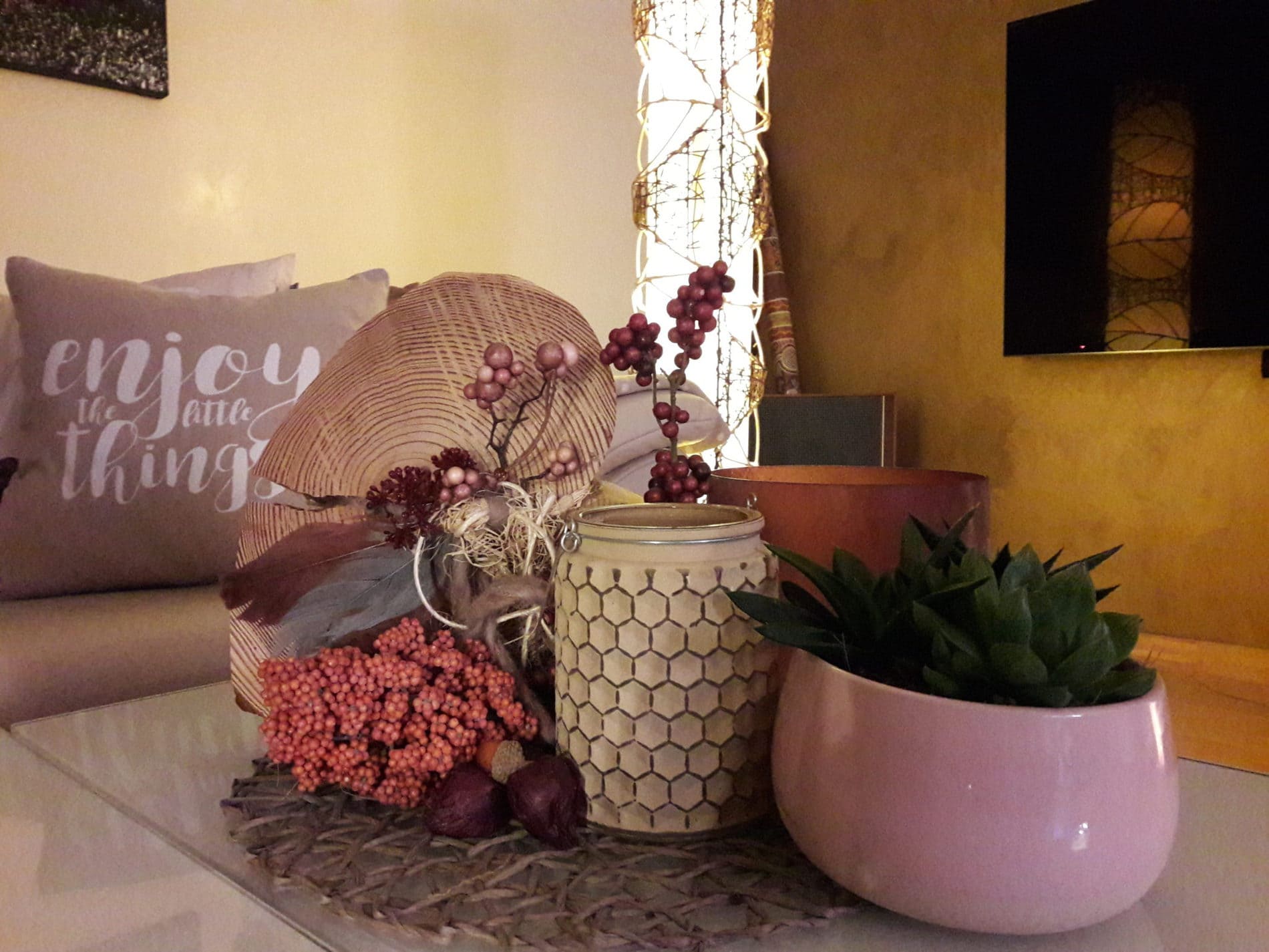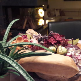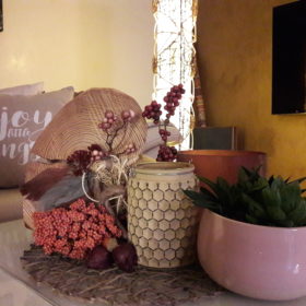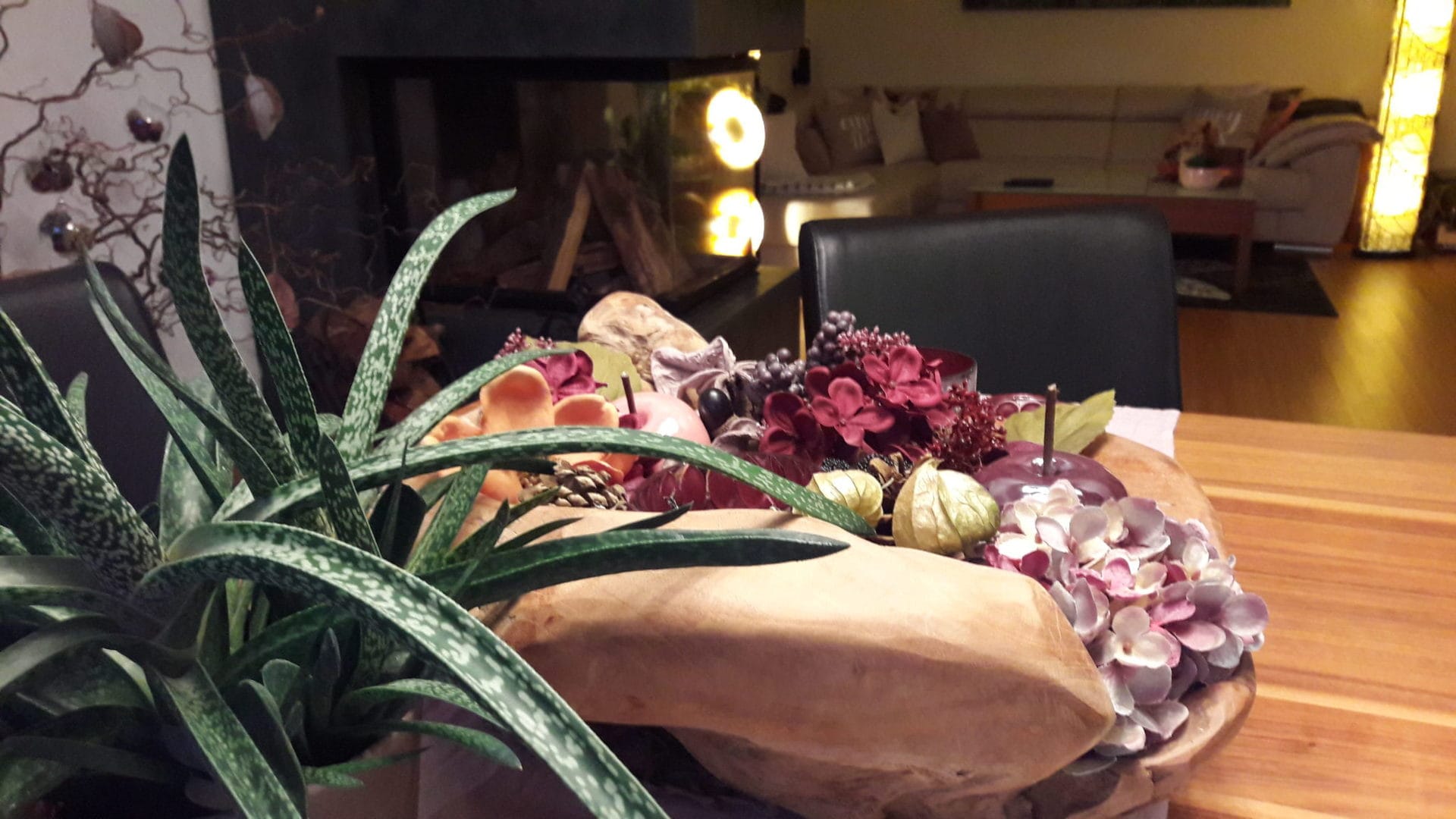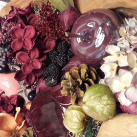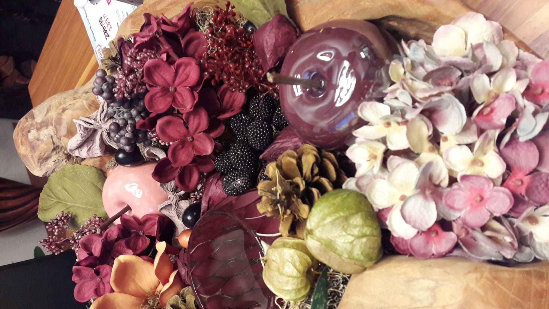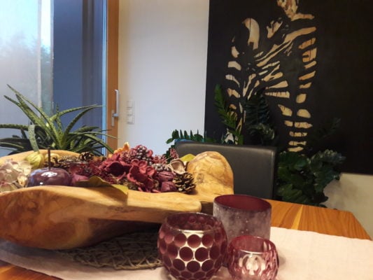 Deshalb habe ich auch mit sehr viel Begeisterung mein Zuhause in „Herbststimmung“ gebracht. Heuer erstrahlt mein Zuhause in den Trendfarben Brombeer und Senf. Diese beiden Farben dominieren in meiner Deko, so habe ich verschiedene Hortensienblüten mit Dekobeeren, Landlotus, farbigen Zapfen, Eicheln und Nüssen, getrockneten Physalisblüten (Lampionblumen),… kombiniert. Ganz wichtig bei mir sind immer Windlichter in allen Größen und Farbnuancen. Ich persönlich finde, dass man im Herbst und der dunklen Jahreszeit nicht genügend Lichtquellen haben kann.